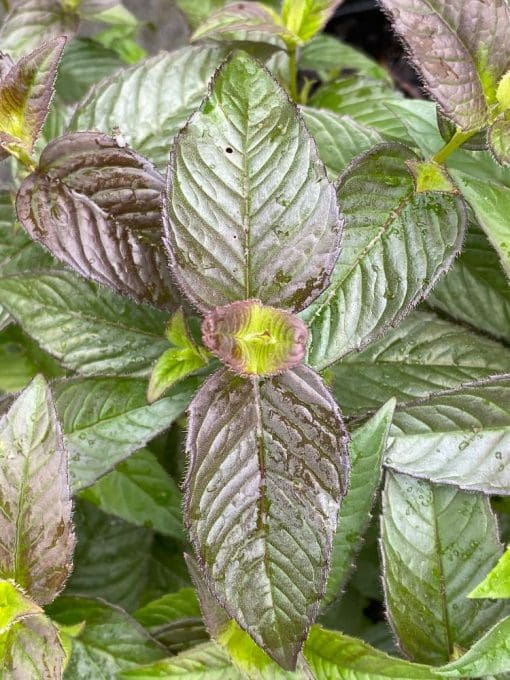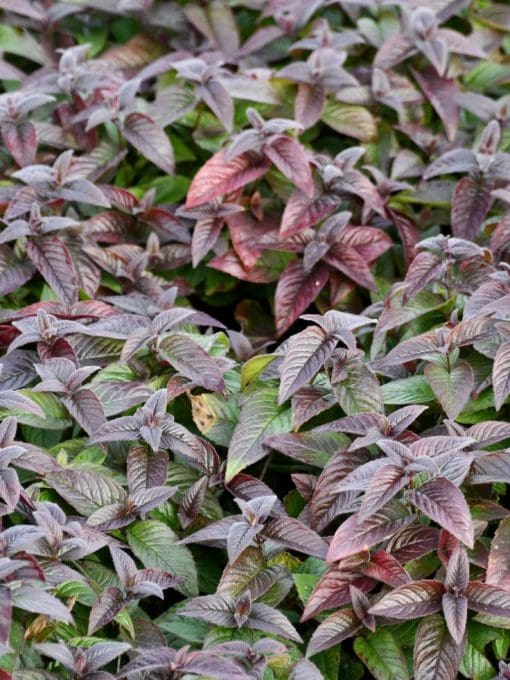 Slow growing mounds with glossy red-purple leaves
